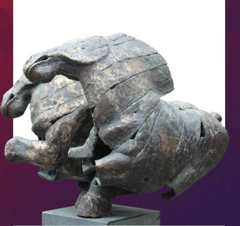 Dit bronzen beeld toont duidelijk de kenmerkende